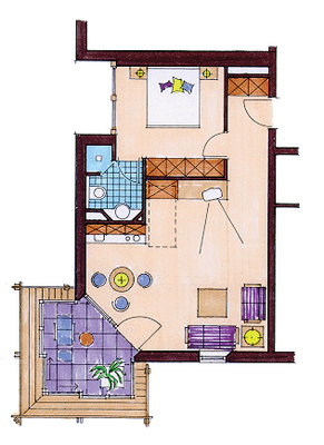 Das De Luxe-Atelier 41m² besitzt eine Empore und Dachterrasse, welche durch eine Treppe im Zimmer erreichbar ist. Das Appartement ist ausgestattet mit einem Doppelbett, Küchenzeile, Sitzecke mit TV und Balkon zum Kurpark. Das Bad ist mit Dusche / WC.